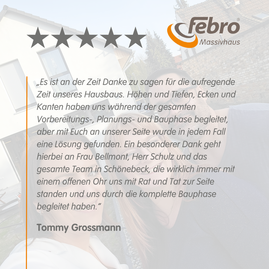 Wir wissen, dass ein Hausbau sowohl besondere Momente als auch Herausforderungen mit sich bringt. Umso mehr freut es uns, dass Sie sich bei uns – insbesondere bei Frau Bellmont, Herrn Schulz und dem Team in Schönebeck – stets gut betreut und unterstützt gefühlt haben.