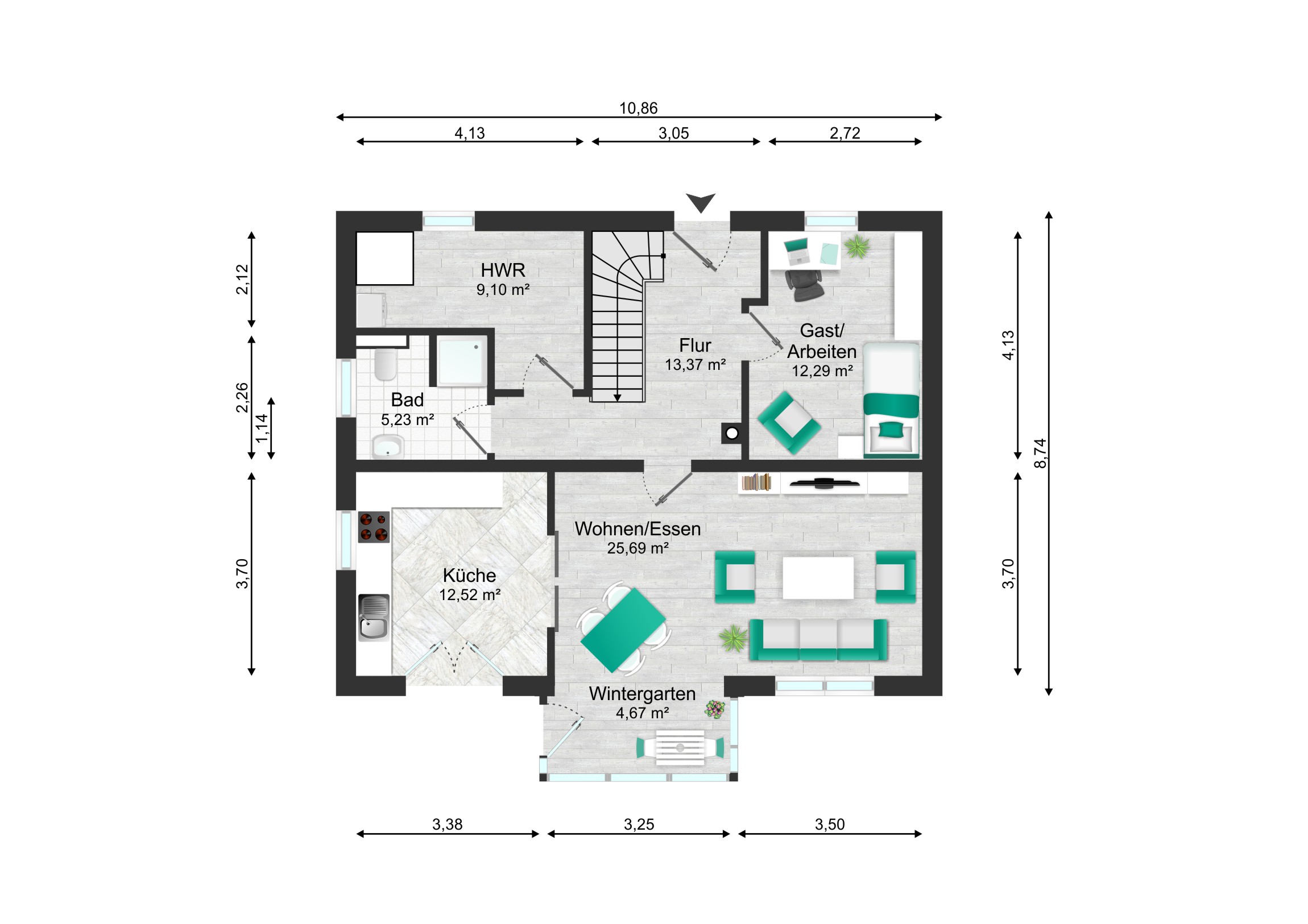 - Baustoff: Poroton T10 ohne zusätzliche Dämmung