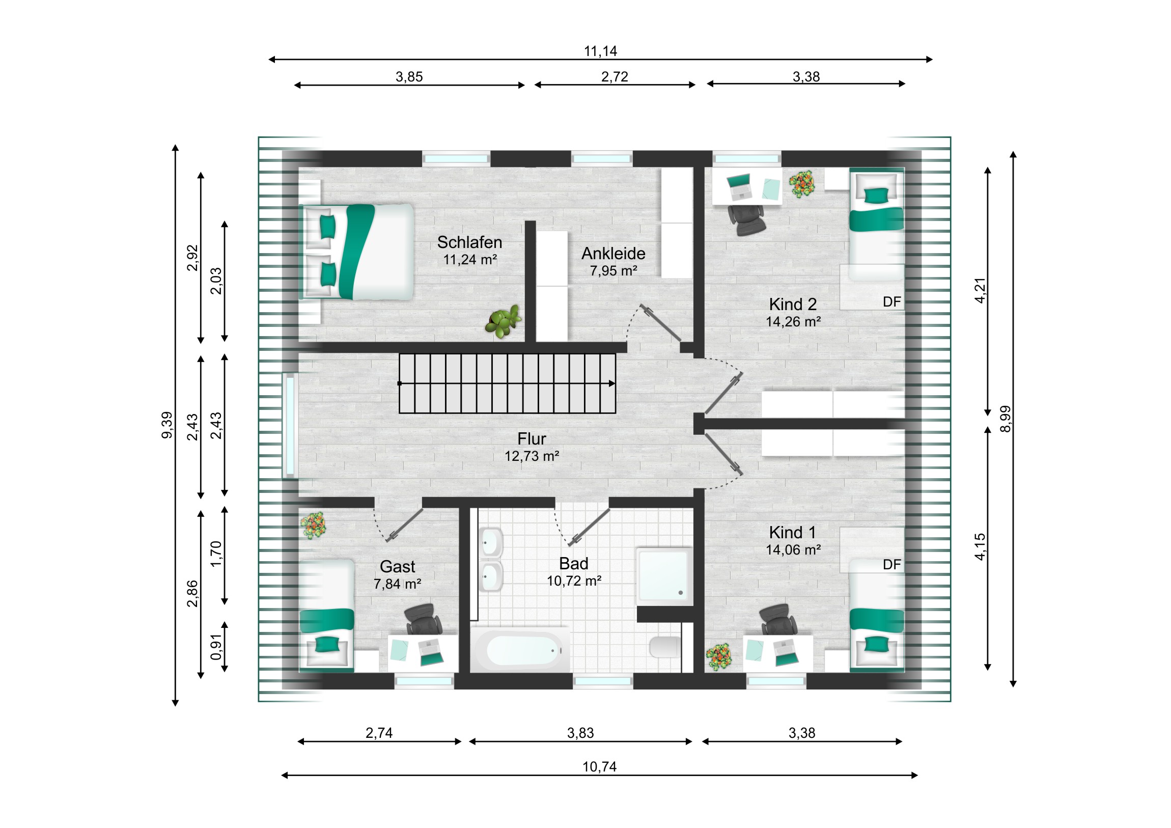 Die beiden Kinder freuen sich über helle Zimmer, die durch den hohen Drempel besonders großzügig wirken. Auch für Gäste ist gesorgt: ein eigenes Zimmer mit angrenzendem Bad und ebenerdiger Dusche macht den Aufenthalt besonders komfortabel.