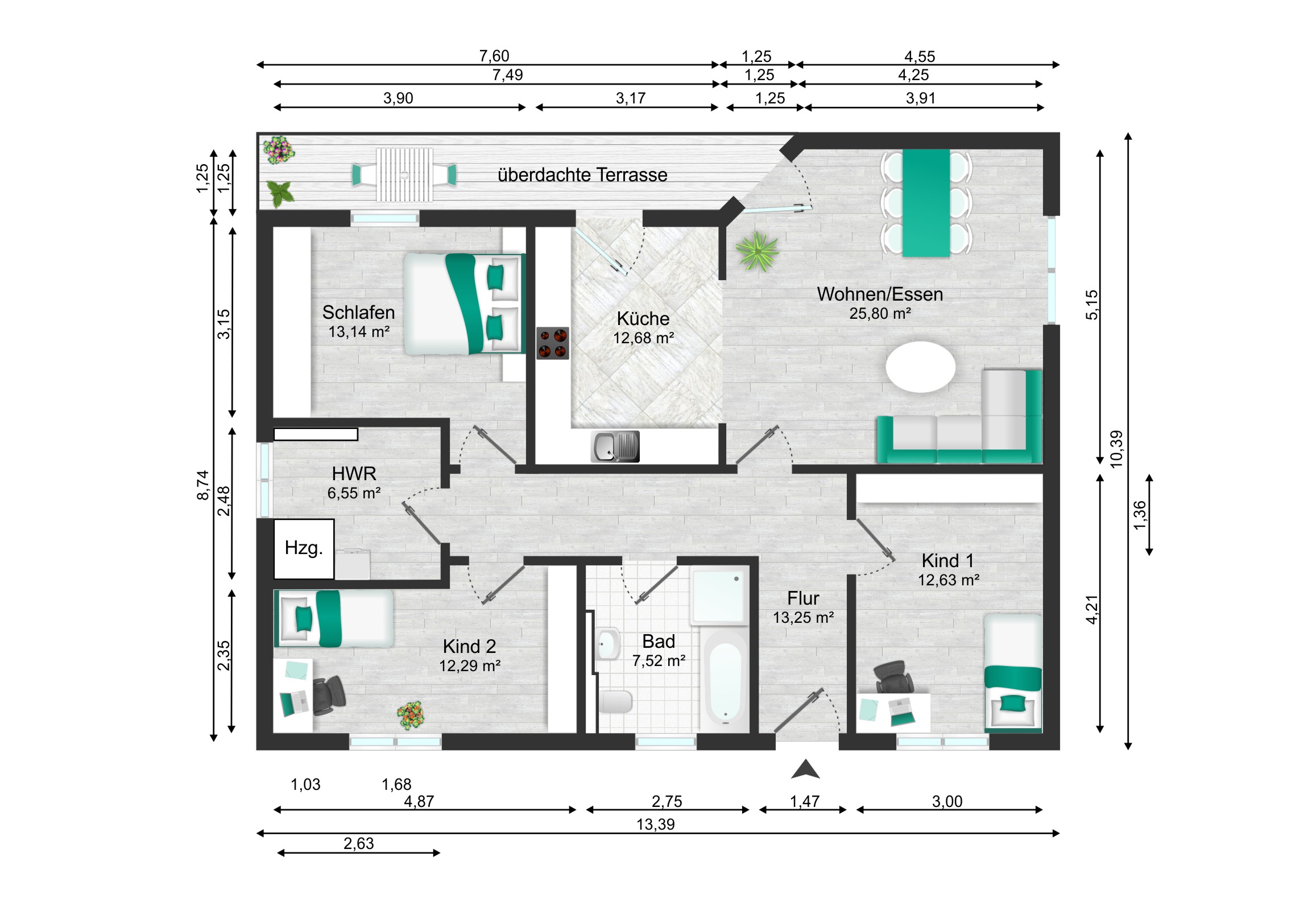- Baustoff: Poroton T14 mit zusätzlicher Dämmung