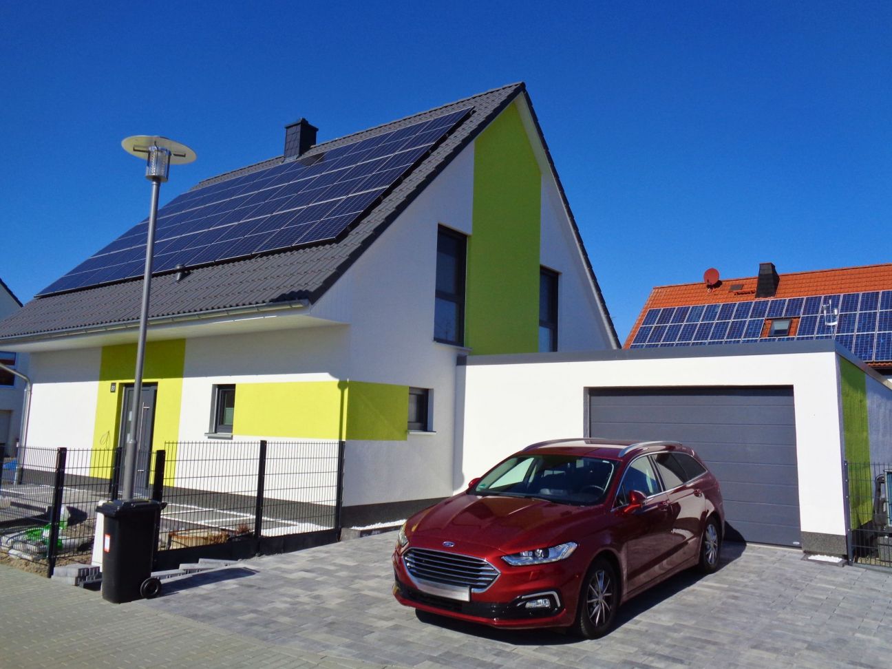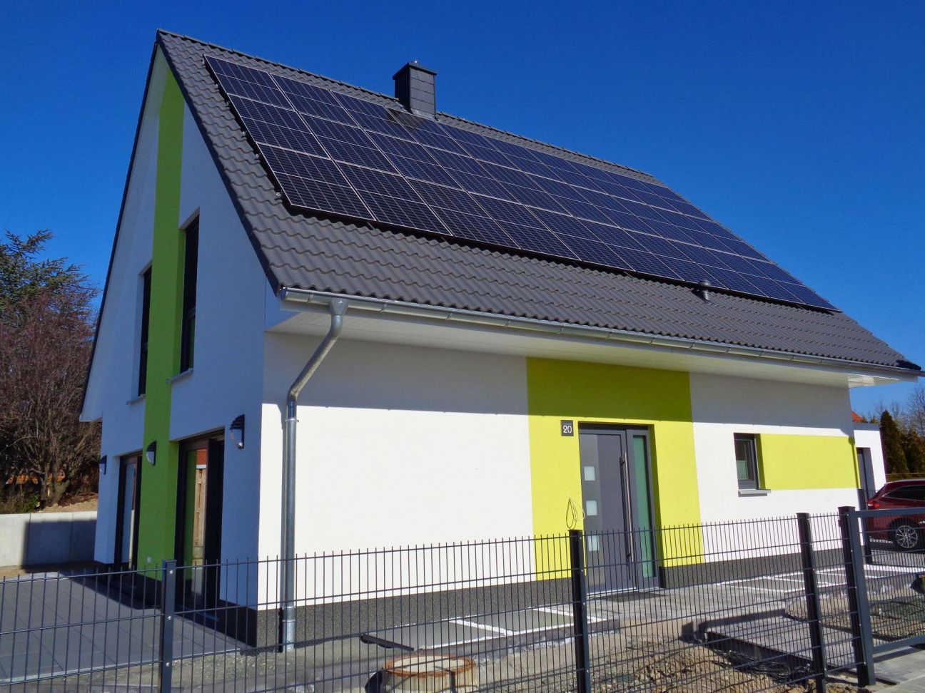 In Leipzig hat Familie W. ihr Einfamilienhaus Coburg gebaut – ausgeführt mit 24 cm Kalksandstein und 10 cm Dämmung für eine solide und energieeffiziente Bauweise. Der Rohdrempel wurde auf 1,20 m angepasst, um mehr Raum im Dachgeschoss zu schaffen. Besondere Highlights sind die farbig folierten Fenster, eine großzügige 2,50 m breite Hebe-Schiebe-Anlage sowie eine zusätzliche Speisekammer im Erdgeschoss. Zudem wurde eine Brandschutztür im Hauswirtschaftsraum als Zugang zur Garage integriert. Die Raumaufteilung wurde individuell an die Wünsche der Familie angepasst.