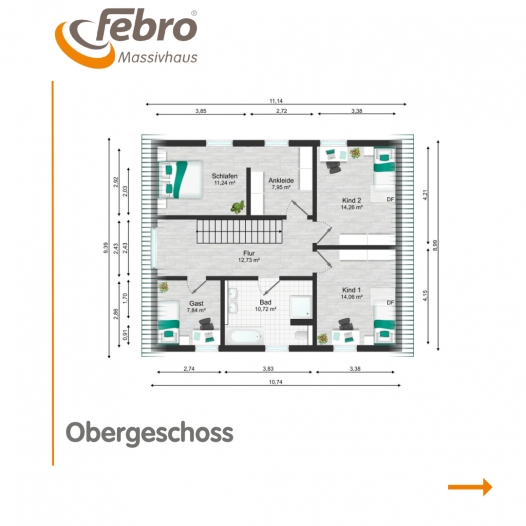 Die beiden Kinder genießen helle, freundliche Zimmer, die durch den hohen Drempel besonders großzügig wirken. Auch Gäste finden ihren eigenen Bereich und dürfen sich über ein komfortables Zimmer mit angrenzendem Bad und ebenerdiger Dusche freuen.