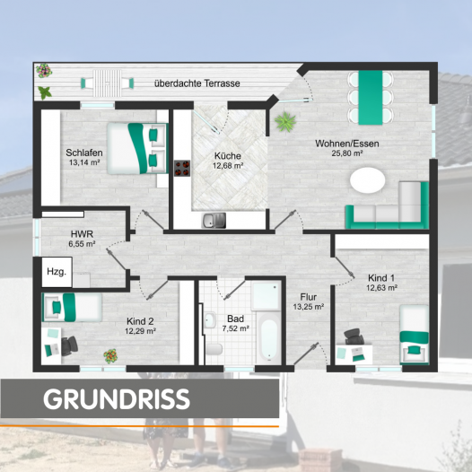 Der Bungalow wurde als Effizienzhaus 40 errichtet und mit Poroton-Planziegeln sowie zusätzlicher Dämmung ausgestattet – eine Kombination, die für Energieeffizienz und ein gesundes Wohnklima sorgt. Mit einer Rohbauhöhe von 2,75 Metern bietet das Haus ein großzügiges Raumgefühl.