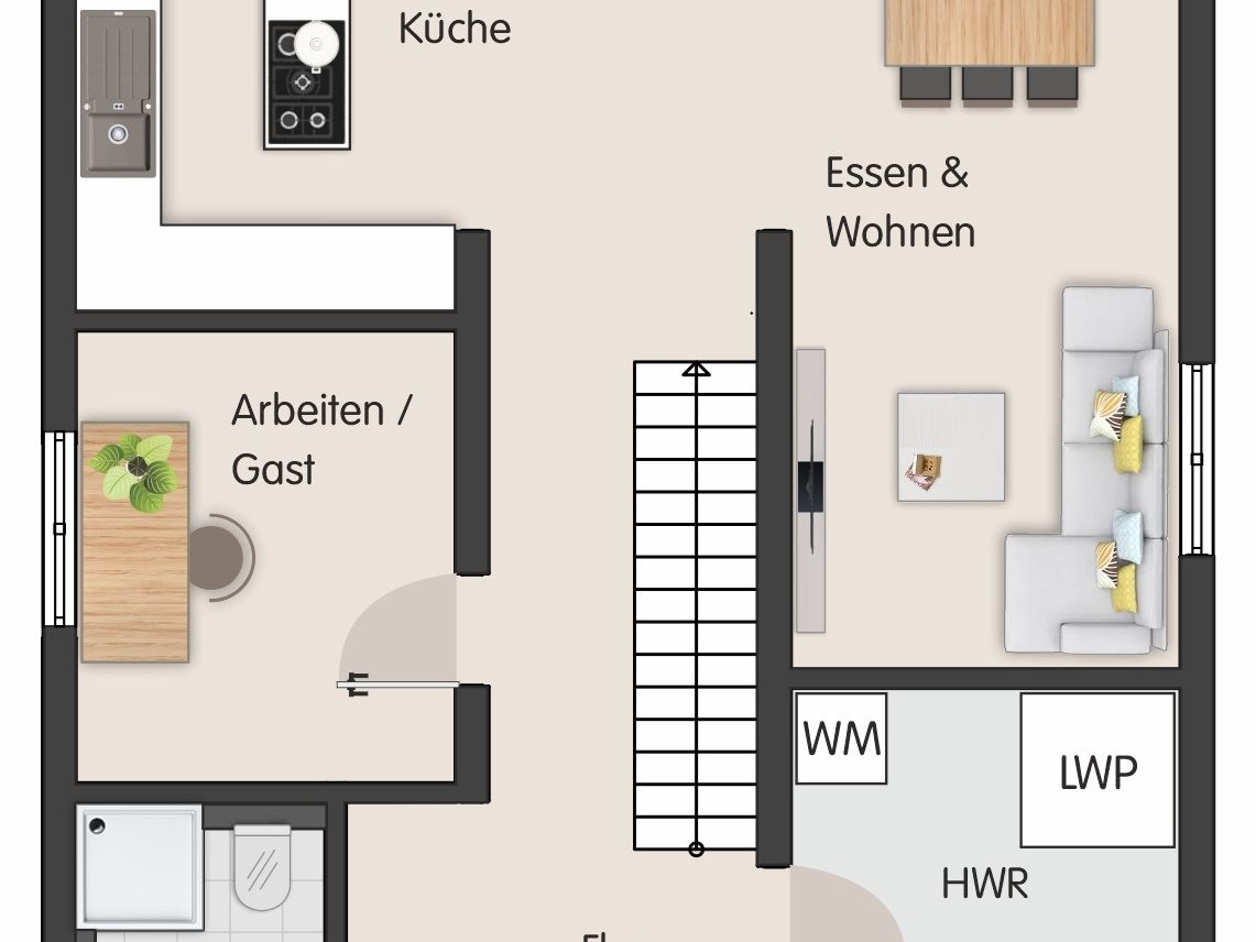 Der Mittelpunkt des Erdgeschosses ist der großzügige Wohn- und Essbereich mit offener Küche. Große Fensterflächen sorgen für eine helle, freundliche Atmosphäre und verbinden den Wohnraum harmonisch mit dem Garten. Zusätzlich steht ein Gästezimmer zur Verfügung, ergänzt durch ein Gäste-WC mit Dusche.