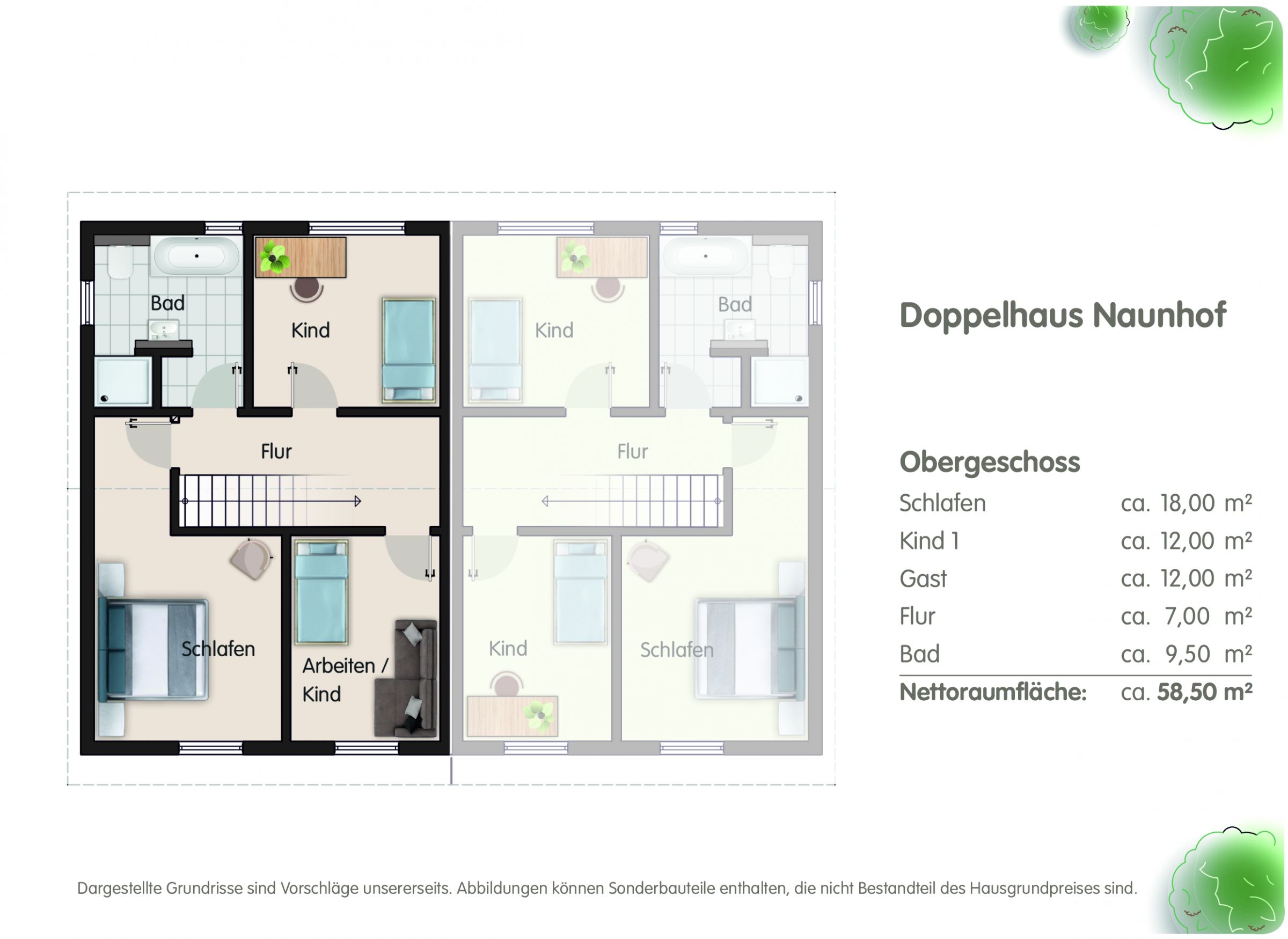 - Nettoraumfläche je Hälfte nach DIN 277: ca. 119 m²