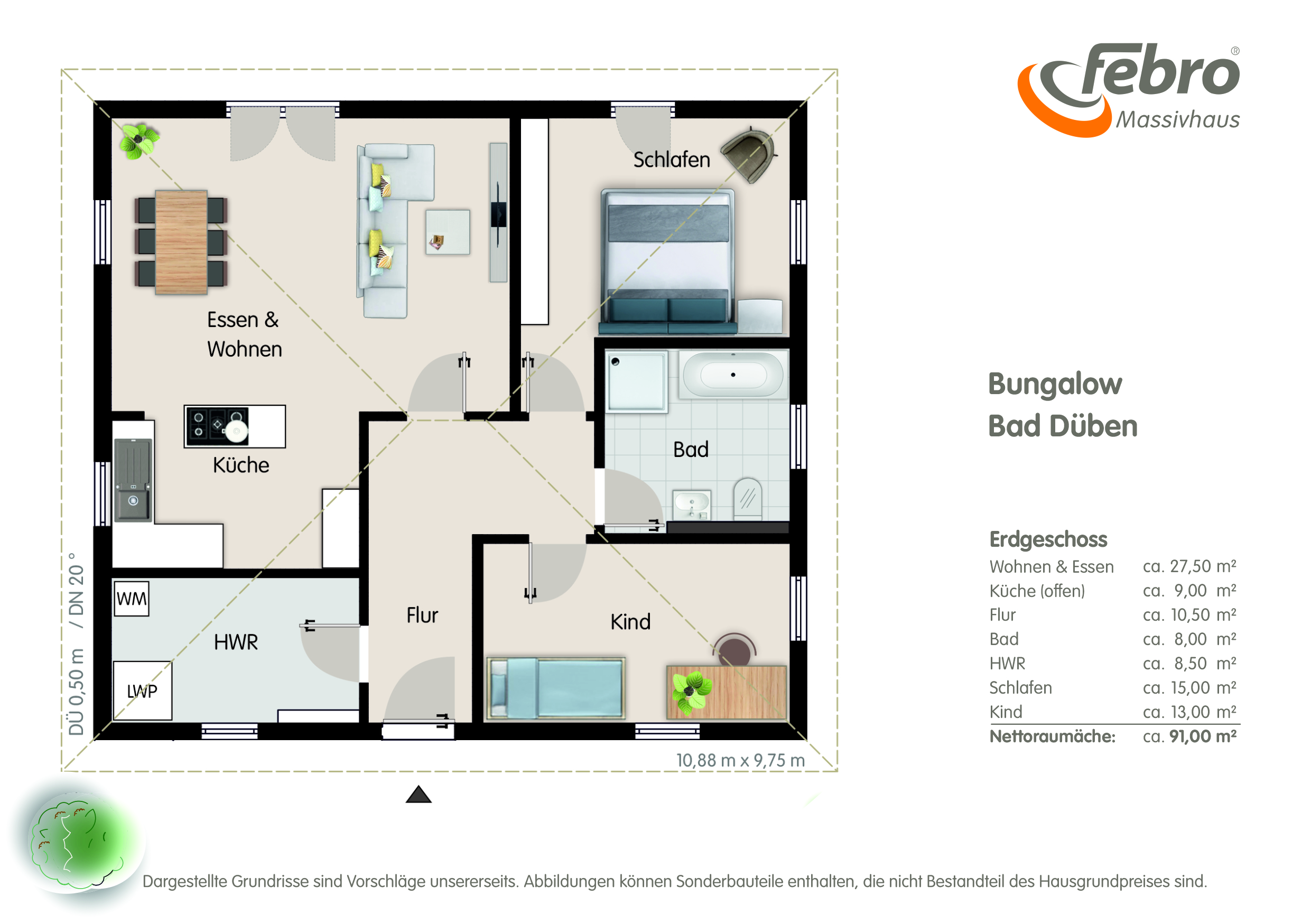 Das Effizienzhaus Bad Düben bietet auf einer Ebene ca. 92 m² Wohnfläche – perfekt, um keine Treppen mehr steigen zu müssen. Das großzügige Wohnzimmer mit offener Küche ist der Mittelpunkt des Hauses und ermöglicht einen direkten Blick in den Garten. Das praktische Bad trennt das gemütliche Schlafzimmer von einem weiteren Raum, der flexibel als Kinder-, Gäste- oder Arbeitszimmer genutzt werden kann.