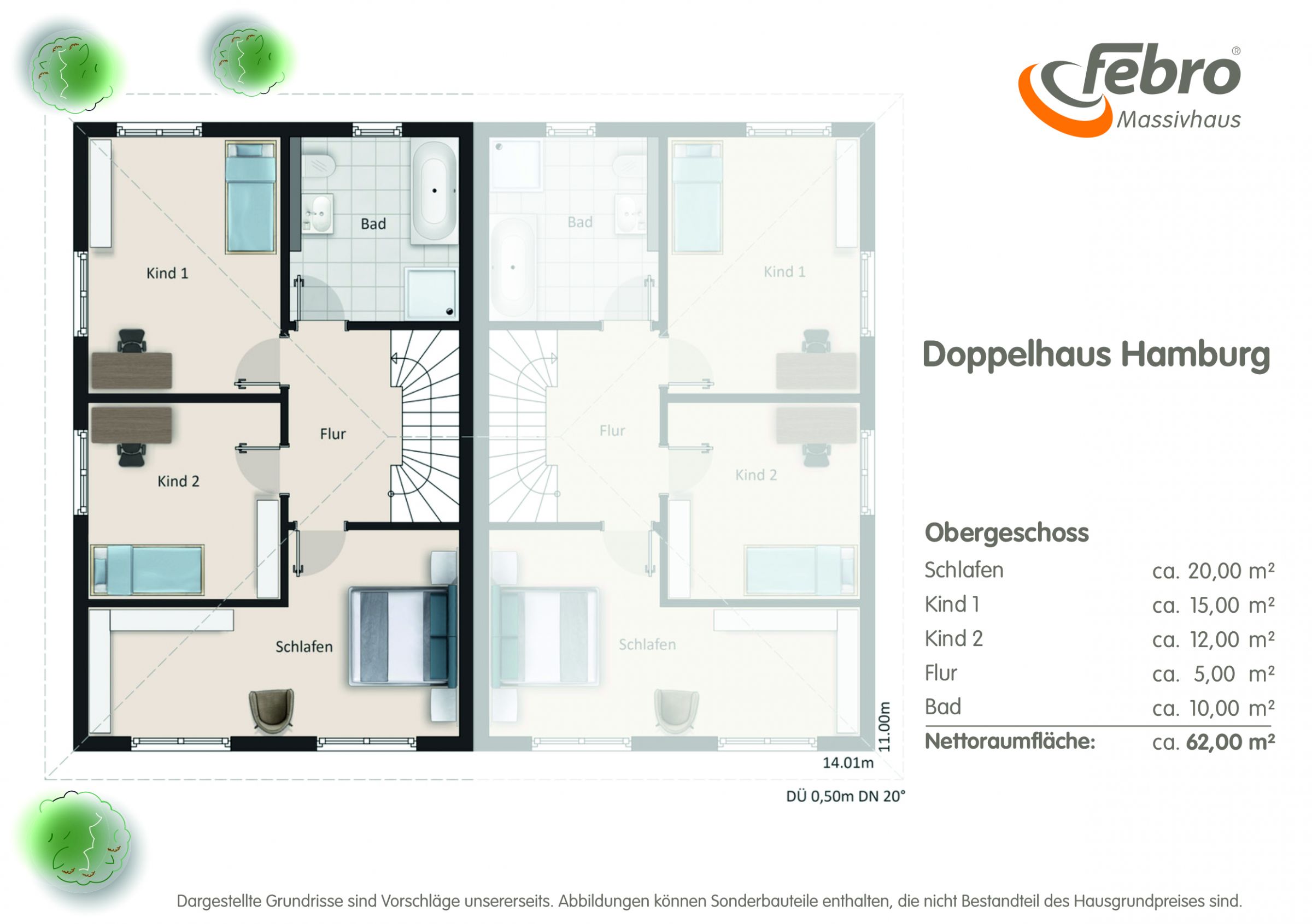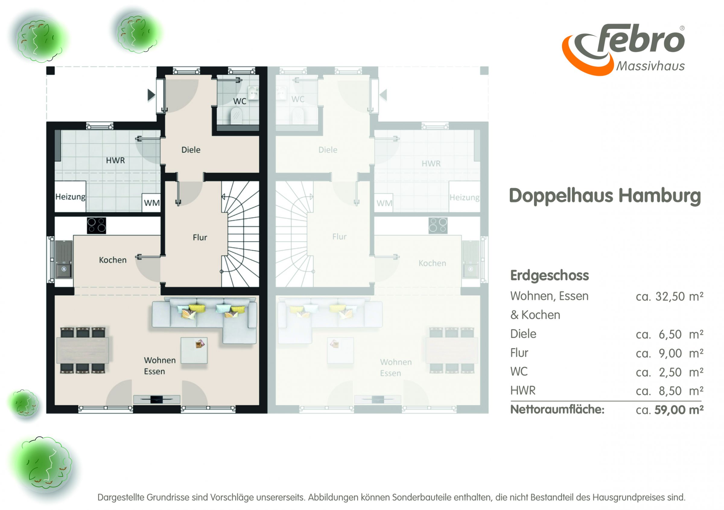 - Nettoraumfläche je Hälfte nach DIN 277: ca. 121 m²