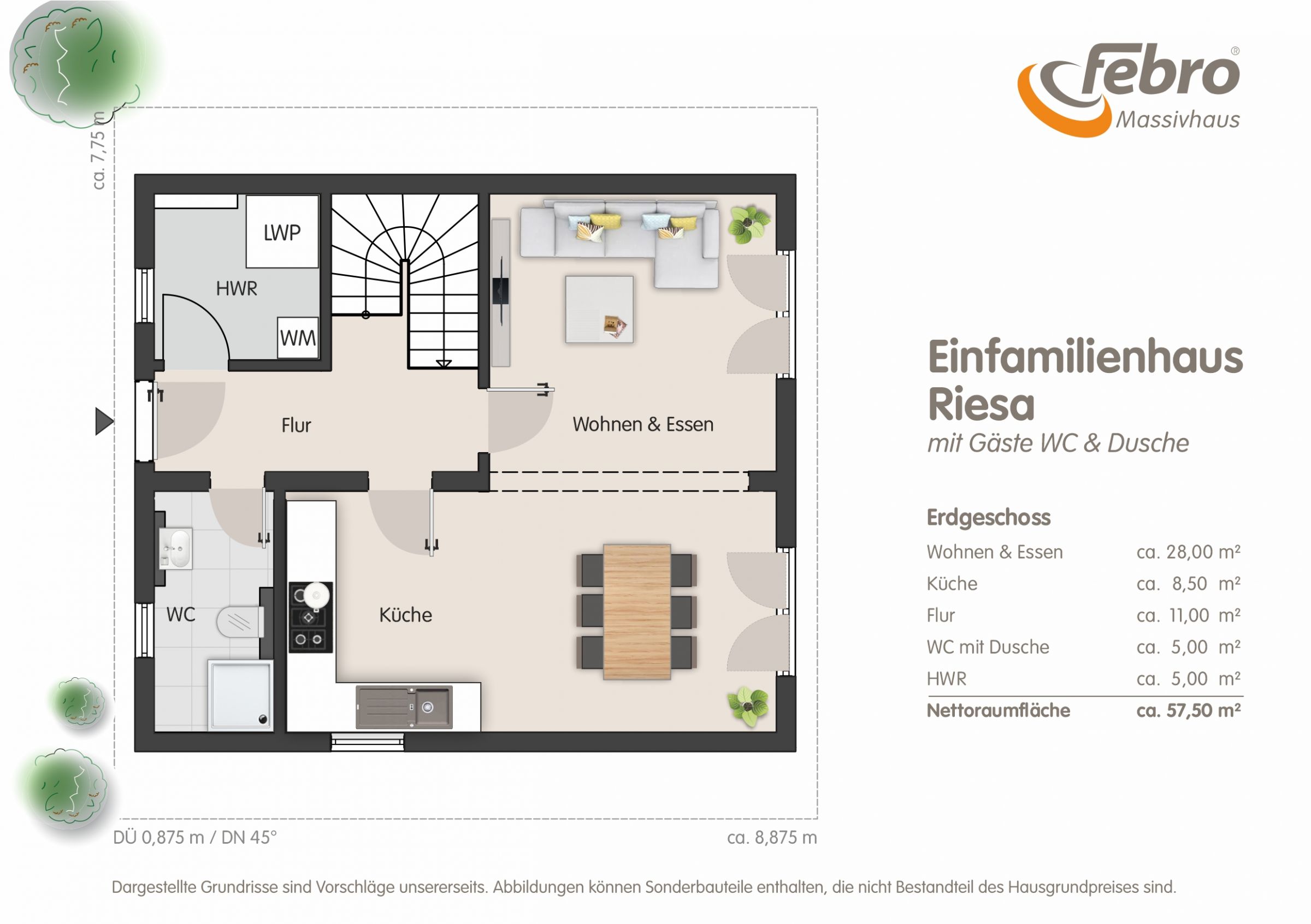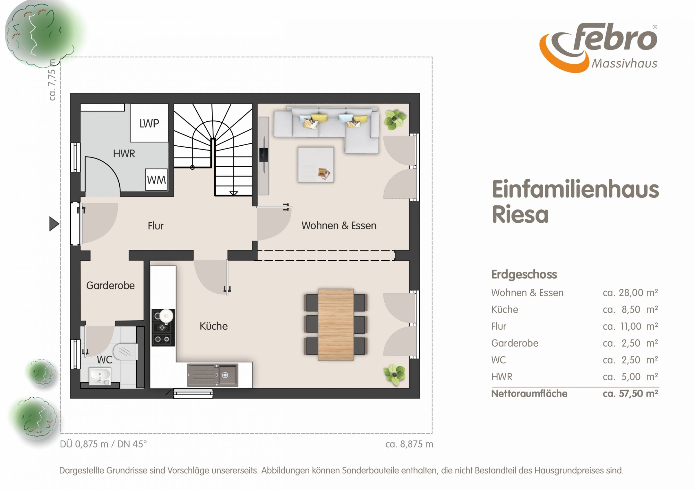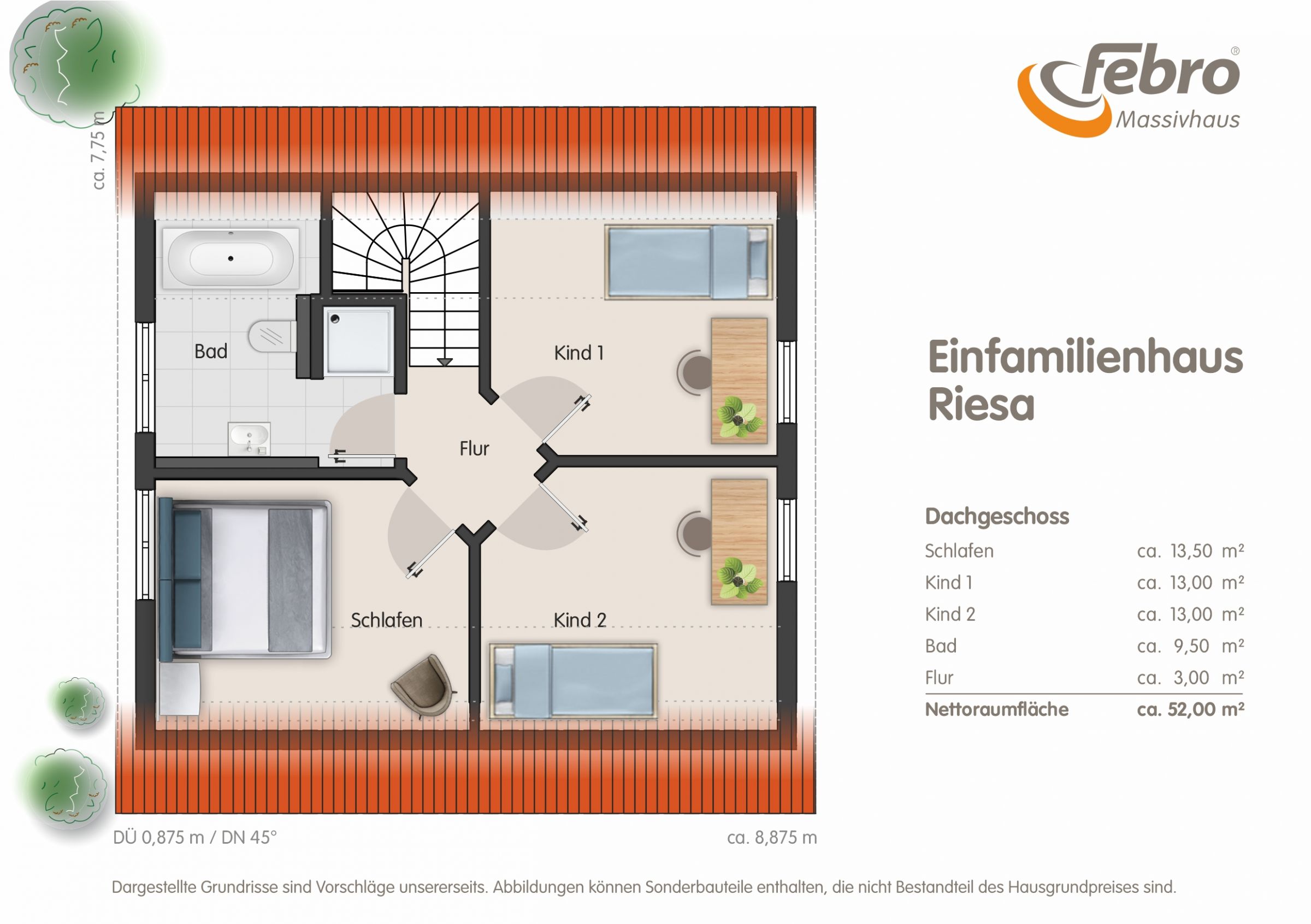 Das Einfamilienhaus Riesa überzeugt mit einer Wohnfläche von 100 m², die eine optimale Verbindung von Komfort und Funktionalität bietet. Die lichtdurchfluteten Räume auf zwei Etagen schaffen eine angenehme Wohnatmosphäre, die Raum für individuelle Bedürfnisse jeder Familie bietet. Im Erdgeschoss befindet sich ein großzügiges Wohnzimmer mit angrenzender, offener Küche, die einen direkten Blick in den Garten ermöglicht. Das Dachgeschoss umfasst ein geräumiges Schlafzimmer sowie zwei flexibel nutzbare Räume, die sich ideal als Kinderzimmer, Gästezimmer oder Arbeitszimmer eignen. Ein modern ausgestattetes Badezimmer komplettiert diese Etage. Dank der kompakten Bauweise ist das Haus Riesa besonders für kleinere Grundstücke prädestiniert und bietet dennoch jedem Familienmitglied ausreichend Rückzugsmöglichkeiten.